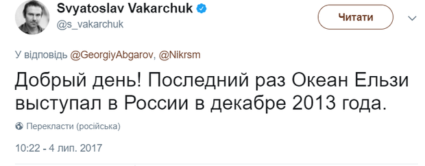 «Добрый день! Последний раз «Океан Ельзи» выступал в России в декабре 2013 года», — написал он в Twitter.