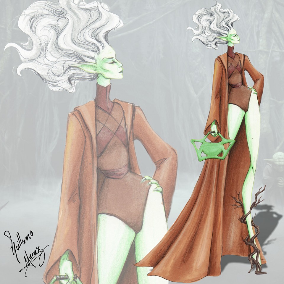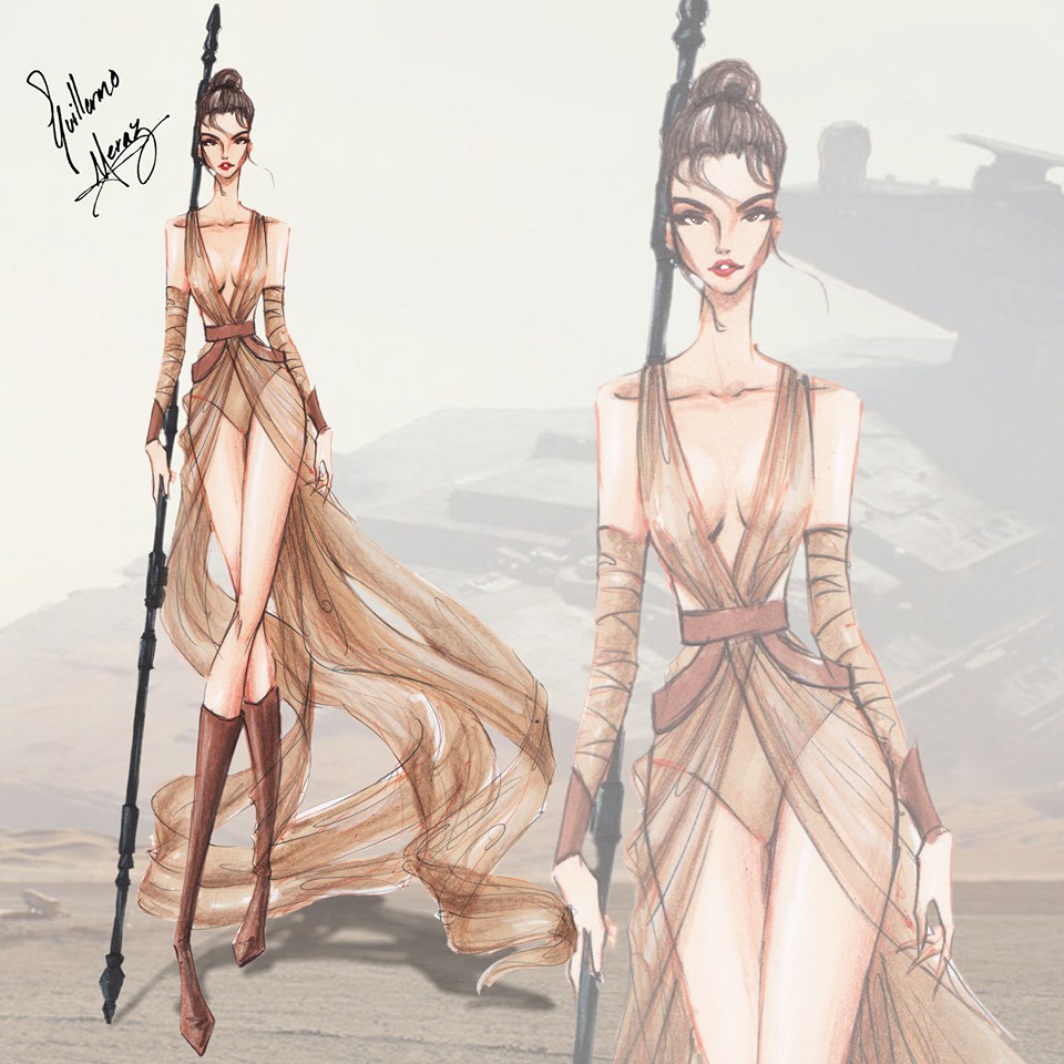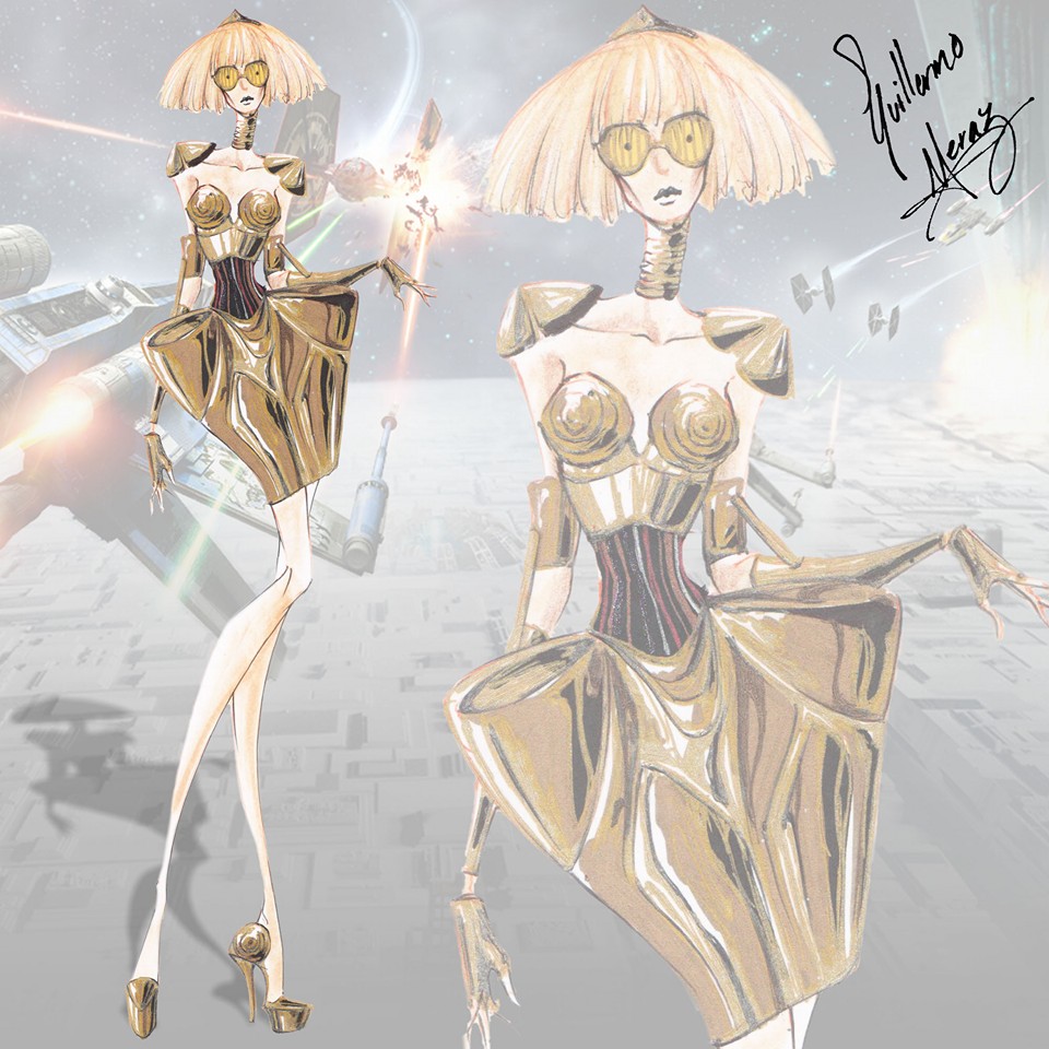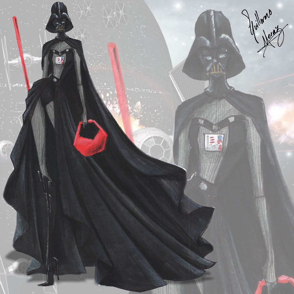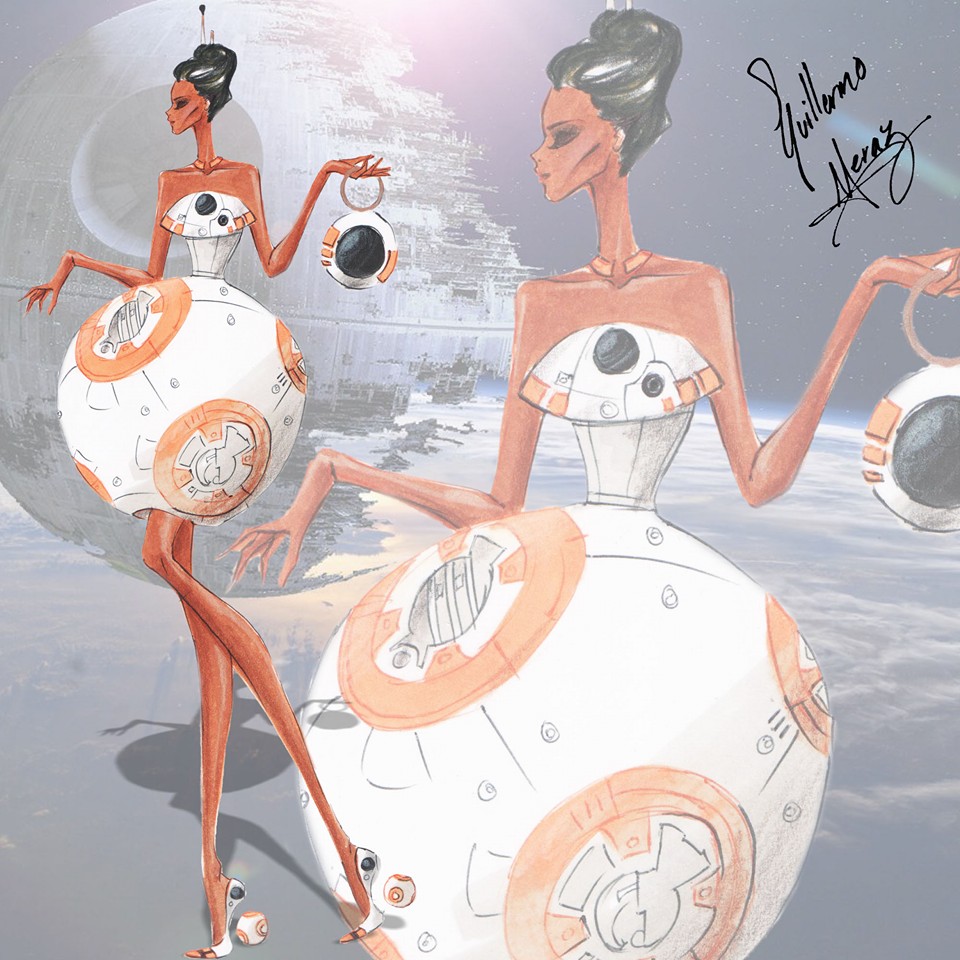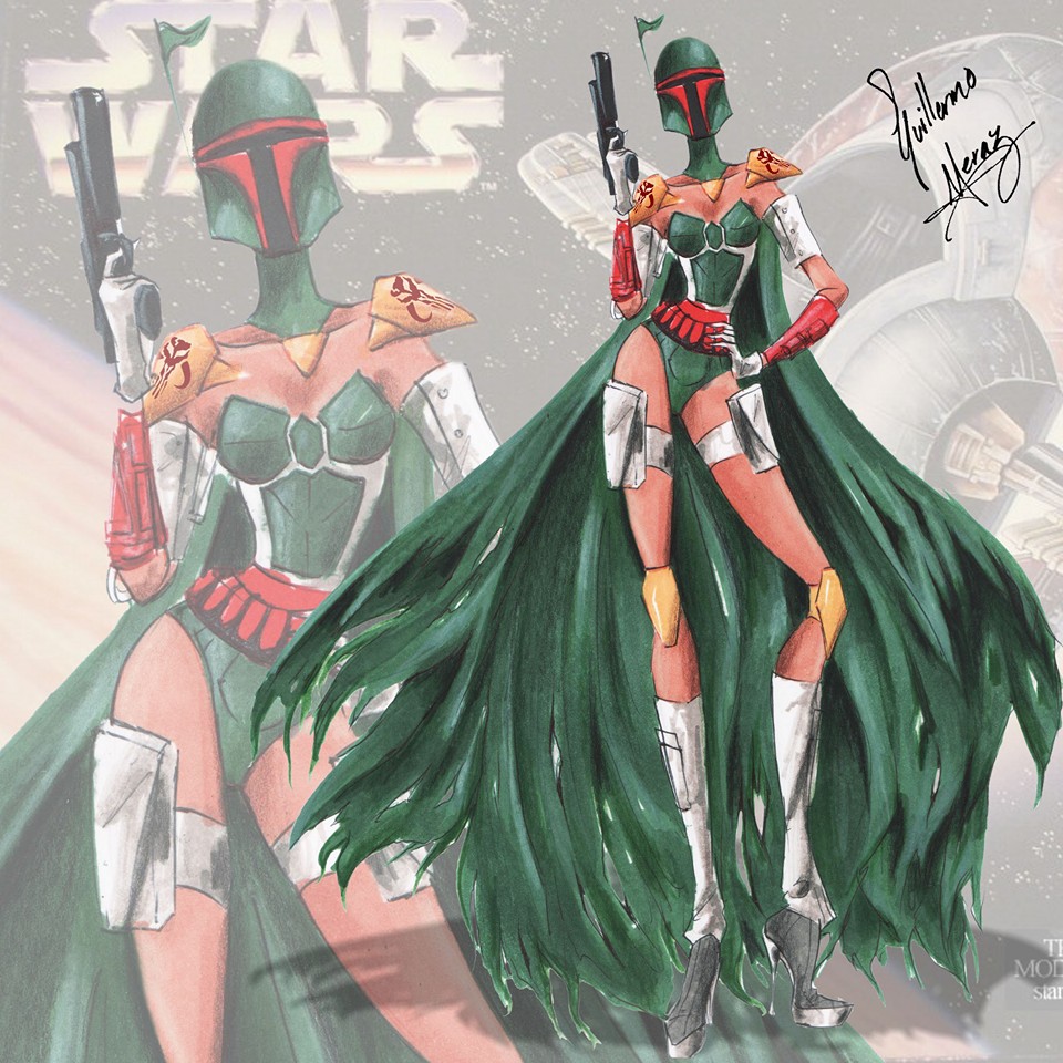 Дизайнер и fashion-художник из Мехико Гильермо Мераза так вдохновился сагой «Звездные войны», что решил создать коллекцию женской одежды с межгалактическим дизайном. Он нарисовал эскизы неординарных платьев на тему Star Wars.Вот что было бы, если бы Дарт Вейдер стал стильной модницей-воительницей, а Чубака перевоплотился в любительницу мехов.