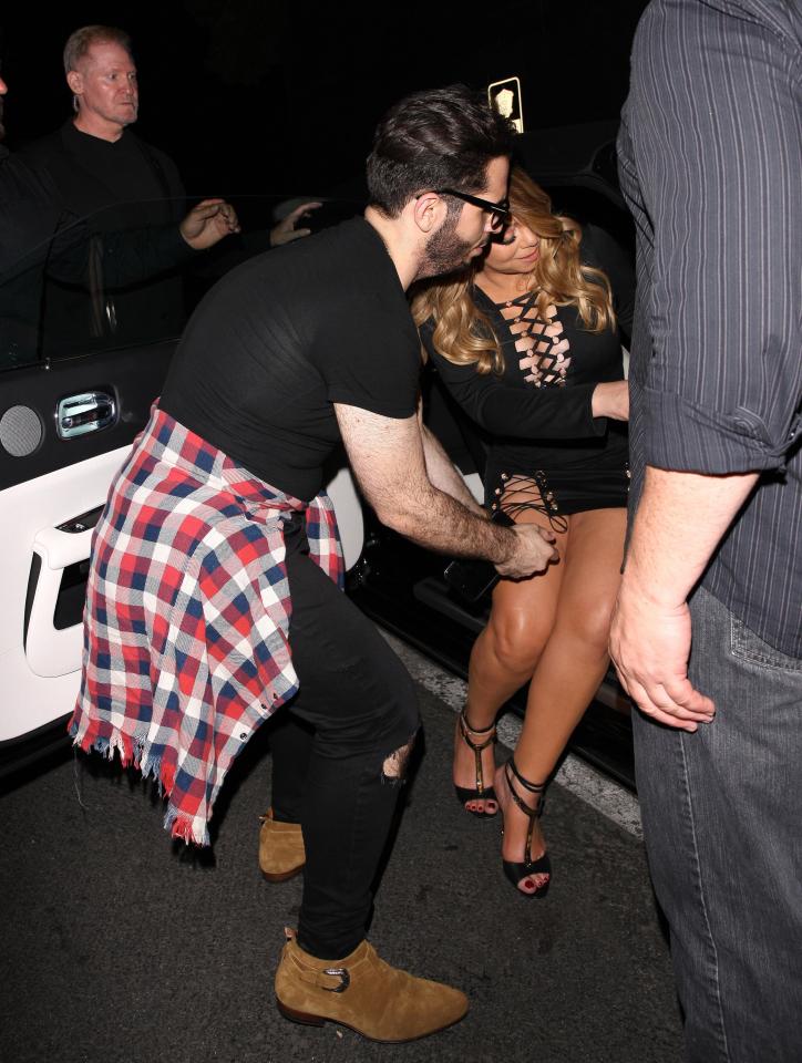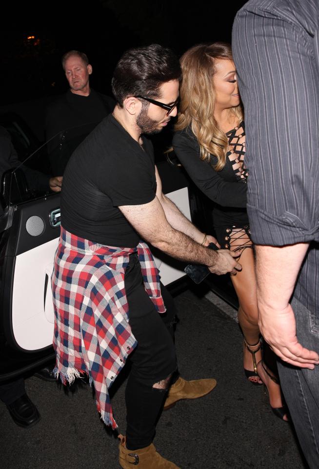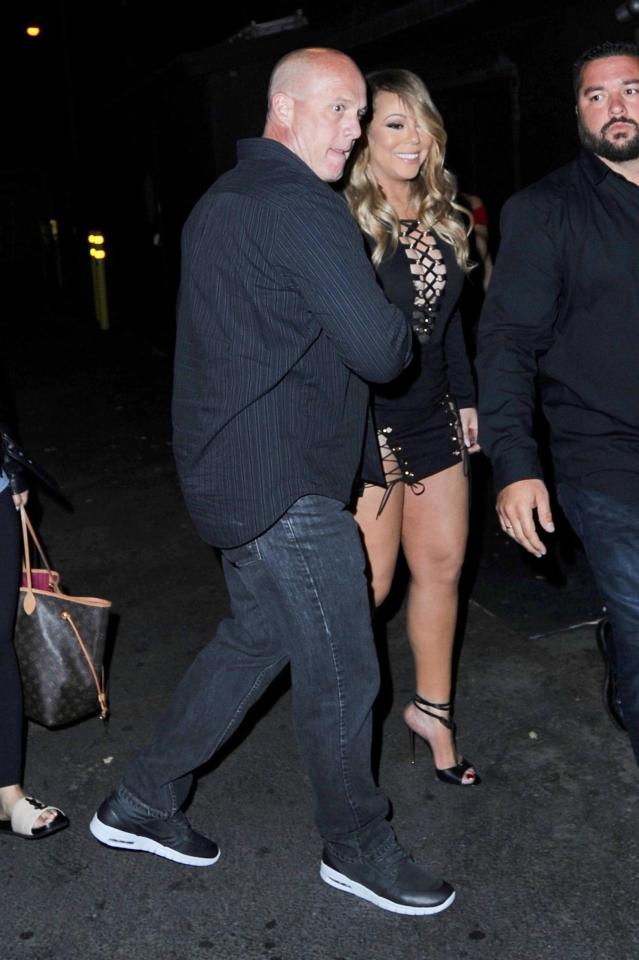 Весьма нескромный наряд не позволил звезде самостоятельно сесть в авто, поэтому ей на помощь поспешил галантный кавалер и ее ассистент, которые усадили 47-летнюю Кэри в машину так, чтобы в объектив фотокорреспондентов не попало ее белье и не произошел конфуз. Сама исполнительница была в отличном расположении духа. Она весело махала рукой и улыбалась.