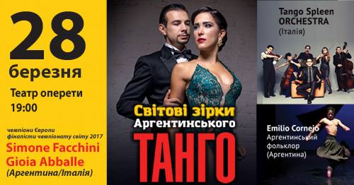 К всемирному дню театра при поддержке Посольства Аргентинской Республики в Украине к 25-летию установления дипломатических отношений между странами в рамках международного тура 28 марта 2018 в 19-00 на сцене Национального театра оперетты состоится концерт мировых звезд аргентинского танго с участием одной из самых известных пар, танцоров и преподавателей мирового класса, учеников основателей Tango Rouge Company, участников самого зрелищного танго-шоу «Noches de Buenos Aires», Чемпионов Европы и Мира — SIMONE FACCHINI и GIOIA ABBALLE (Аргентина / Италия) в сопровождении итальянского танго-оркестра «Tango Spleen Orquesta».