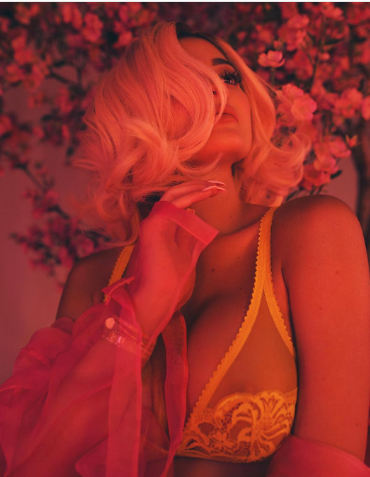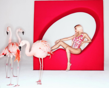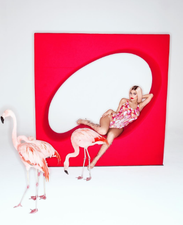 Снимки были сделаны в розовых тонах при интимном, приглушённом освещении. Кайли позирует в окружении розовых фламинго и розового мотоцикла. Сама же модель при этом позирует в нижнем белье также розового цвета, иногда беря в руки японский зонт.