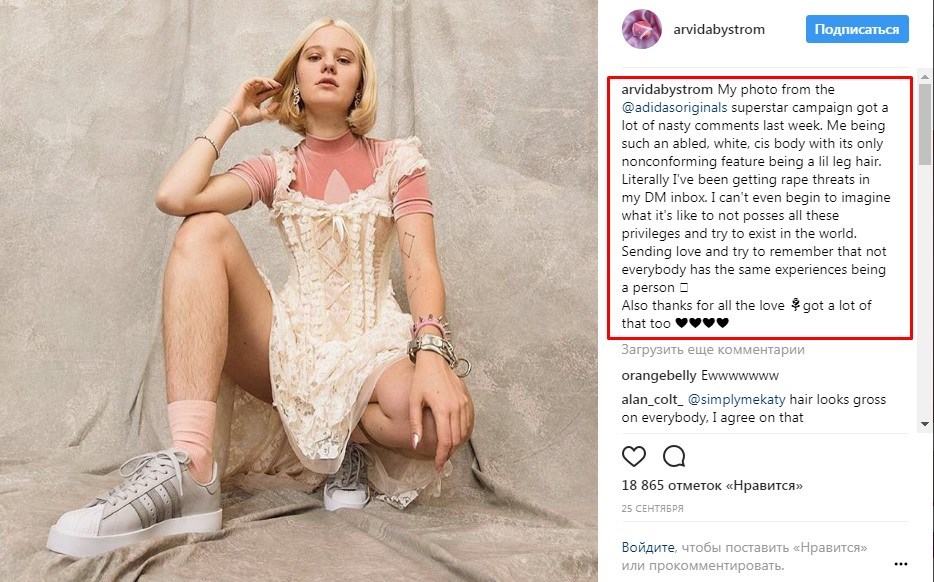 В сети разгорелся ажиотаж вокруг фотографий шведской модели Арвиды Бистрем, которая позирует для бренда одежды Adidas. Увидев снимки, некоторые пользователи сети зареклись покупать товары компании.