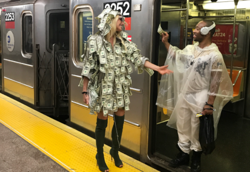 Известная модель Виктория Ксиполитакис, которая прославилась своими пикантными фотосессиями для издания Playboy, провела эпатажную акцию, которая заключалась в том, что она спустилась в метро Нью-Йорка. На девушке при этом было платье из долларов. Она предлагала каждому желающему снять сколько угодно купюр с её тела.