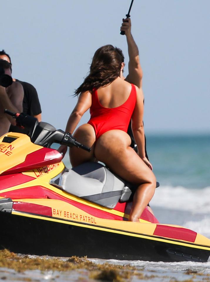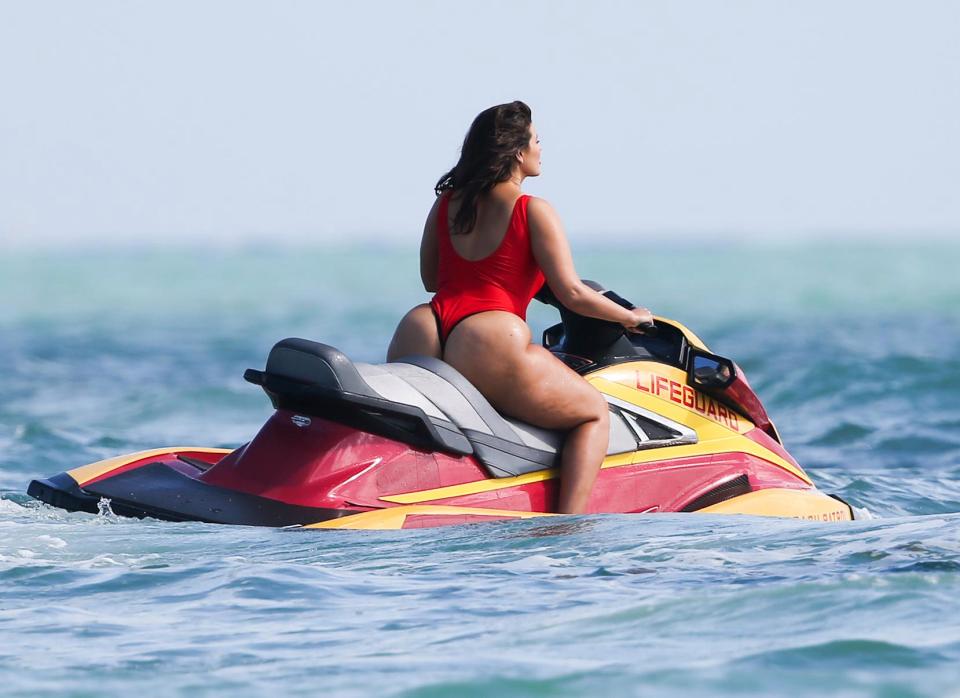 Съемка состоялась на пляже в Майами. 29-летняя модель позировала на скутере в красном купальнике.