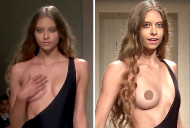Вначале девушка дефилировала перед зрителями, прикрыв правую грудь рукой. Дойдя по конца подиума, она убрала ладонь и удивленная публика смола детально рассмотреть ее грудь и сосок.