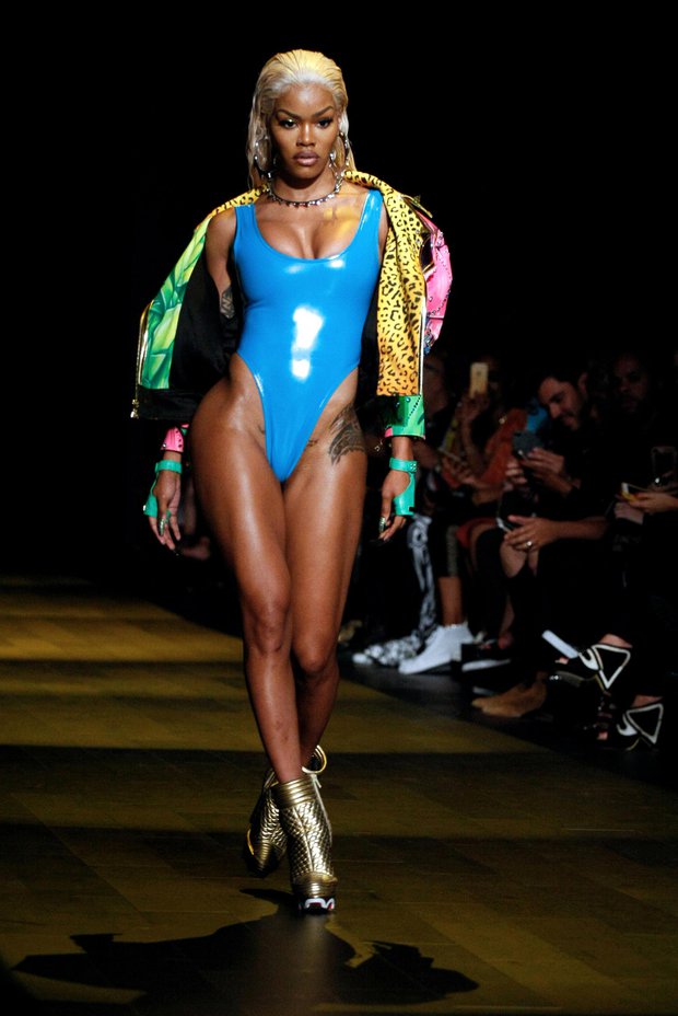 Модель Тейана Тейлор появилась на показе в рамках Недели моды в Нью-Йорке в эффектном латексном купальнике с узкой линией бикини.