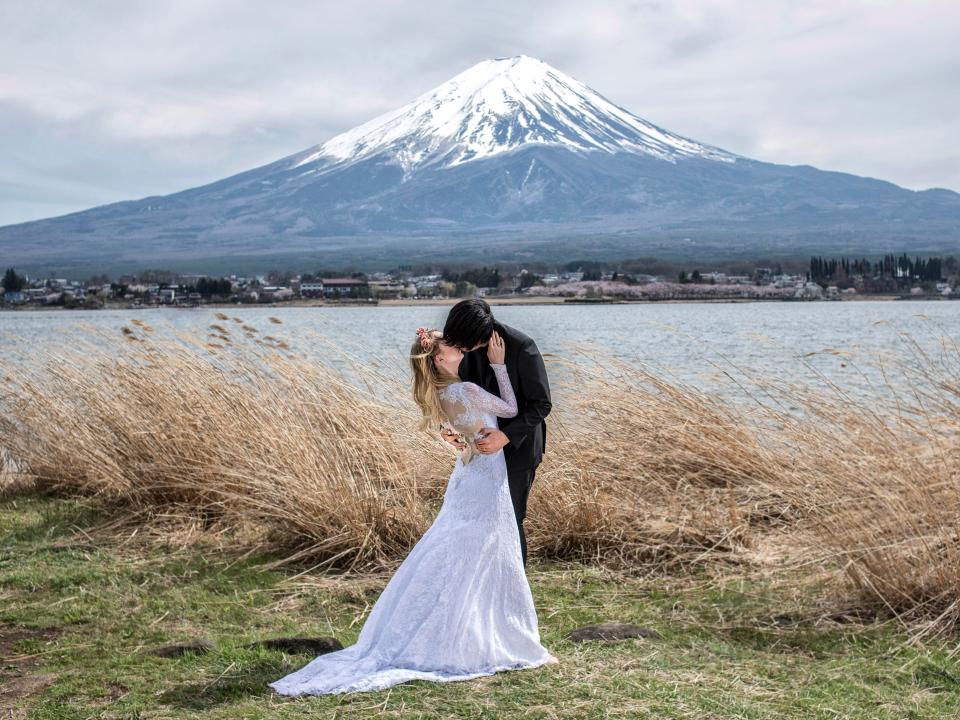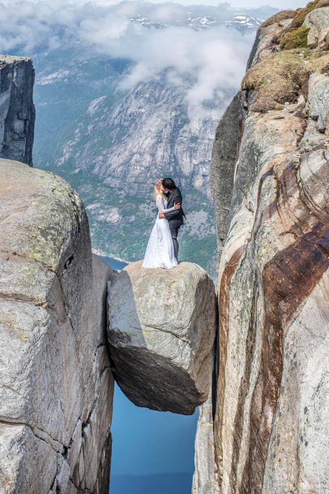 Малазийский фотограф Кео Ви Лунг и его жена из Польши Марта Сиберяк, которые познакомились в Японии, решили продлить самый сладкий романтический момент в жизни. Среди их снимков даже есть запечатленный поцелуй на высоте 3000 м над уровнем моря на валуне в Норвегии, застрявшем между гор.