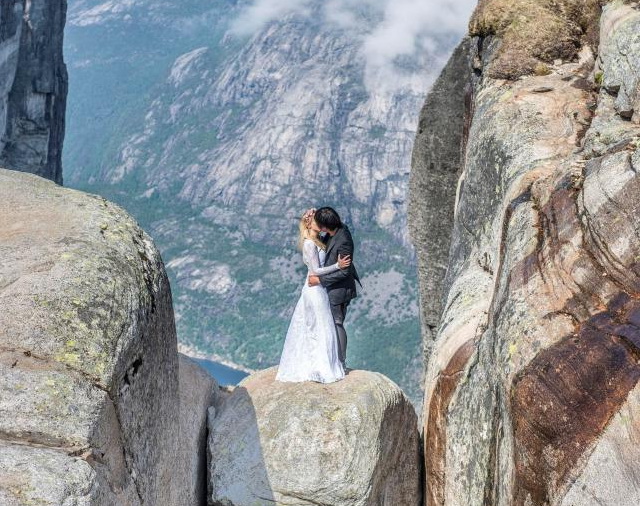 Малазийский фотограф Кео Ви Лунг и его жена из Польши Марта Сиберяк, которые познакомились в Японии, решили продлить самый сладкий романтический момент в жизни. Среди их снимков даже есть запечатленный поцелуй на высоте 3000 м над уровнем моря на валуне в Норвегии, застрявшем между гор.