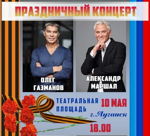 На оккупированной Россией части Донбасса 10-11 мая с концертами выступят российские артисты Олег Газманов, Александр Маршал, Виктория Цыганова, бывший лидер рок-группы «Агата Кристи» Вадим Самойлов и другие московские звезды.
