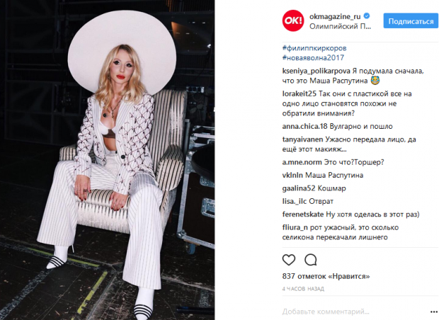 Фото и видео с этим костюмом певица выложила на своей странице в социальной сети. Он представляет из себя широкие брюки, распахнутый пиджак, лифчик и шляпу с огромными полями. Именно в таком облачении она вышла на сцену фестиваля «Новая волна». Многие отметили, что такая шляпа напоминает плафон для торшера или на блюдо для торта.