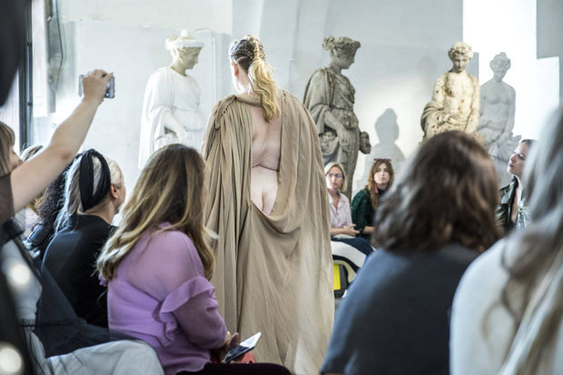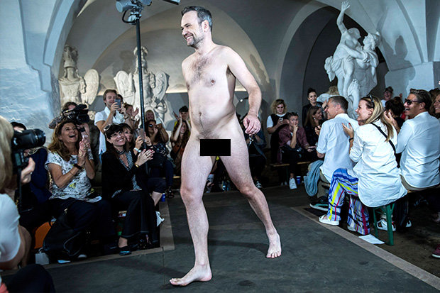 Некоторые из его моделей вышли на подиум в греческих туниках на голове тело и причудливых полушубках, а другие появились просто полностью голыми.
