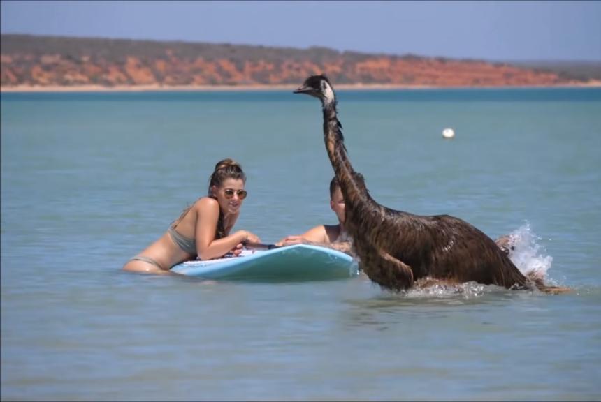 Эту нетривиальную ситуацию сняли на камеру очевидцы. В ролике большая птица как ни в чем ни бывало плавает рядом с парой британцев. Эму настолько занят водными процедурами, что даже не обращает внимания на людей.