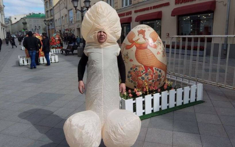 Полиция остановила его «за нарушение гражданского порядка». Таким образом, авторы передачи хотели подшутить над декором в центре Москвы, которая безвкусно загромождена яйцами специально к православному празднику.