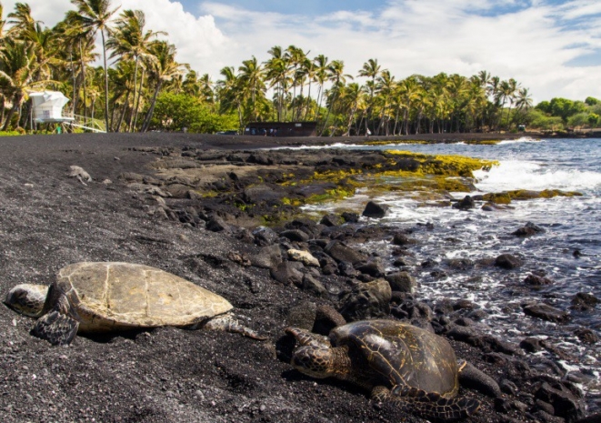 Гавайские острова, чёрный песок на которых образовался за счёт фрагментов лавы.