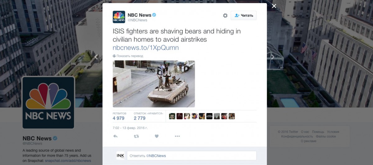 13 февраля официальный твиттер NBC News сообщил, что «Бойцы ИГ бреют медведей и прячутся в домах мирных жителей, чтобы избежать авиаударов».
