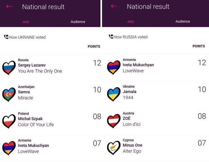 Украинцы отдали России 12 баллов, россияне Украины — 10. В то же время жюри обеих стран обменялись полными нулями.