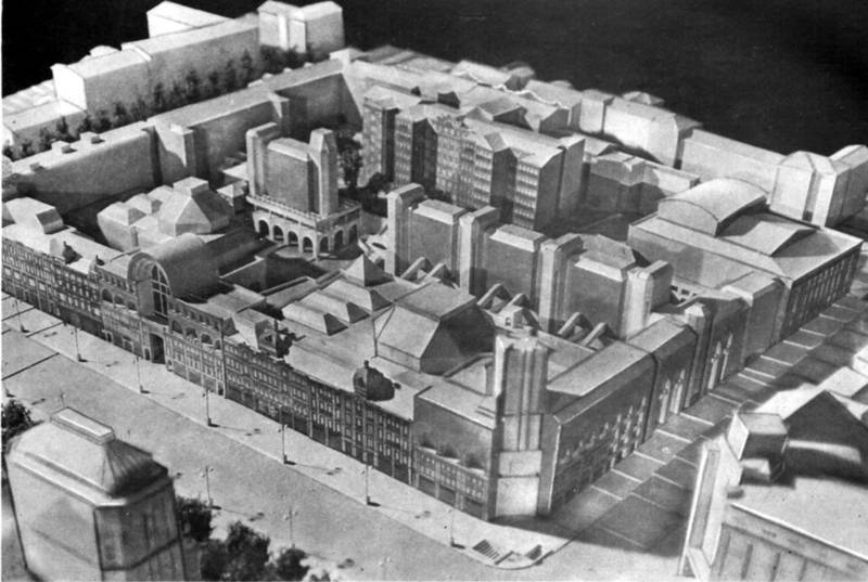 Напротив ЦУМа планировали построить симметричное здание с башней. Внутри собирались делать огромный торговый центр с подземными площадями и галереями. Учитывая советскую торговлю, можно лишь представить наполнение этих территорий. На Крещатик выходил главный фасад торгового центра с аркой, похожий на железнодорожный вокзал.