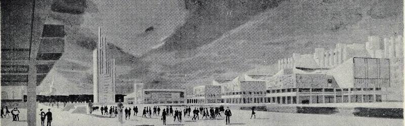 В центре мы видим идеальное модернистское пространство – пустота, бассейны и огромные монументальные здания.