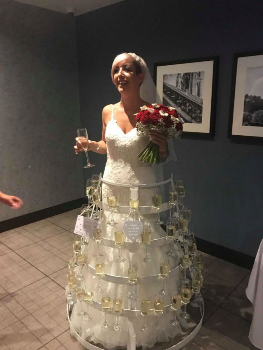 Келли МакМиллан из Эдинбурга в день своей свадьбы облачилась в необычное платье. Ее наряд может уместить 50 бокалов шампанского и служит подставкой. Об этом сообщает The Sun.