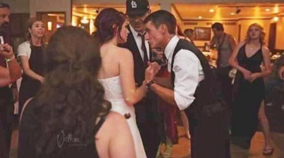 Обычный свадебный снимок, на котором невеста разговаривает с гостями мог бы стать очередным фото из семейного альбома. Из-за пикантной оптической иллюзии кадр приобрел популярность в Сети.