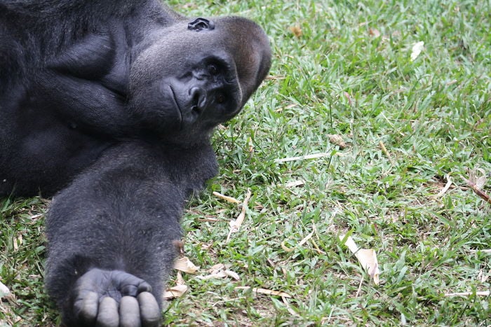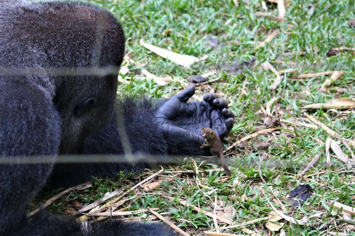 24-летняя огромная горилла Бобо отправился осматривать свои владения, когда внезапно встретил детеныша галаго – представителя семейства ночных приматов. Следует отметить, что увидеть в дневное время это животное – большая редкость. Об этом сообщает Bored Panda.