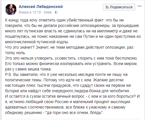 Российский музыкант Алексей Лебединский, поддерживающий Украину, написал острый пост о путинской власти.