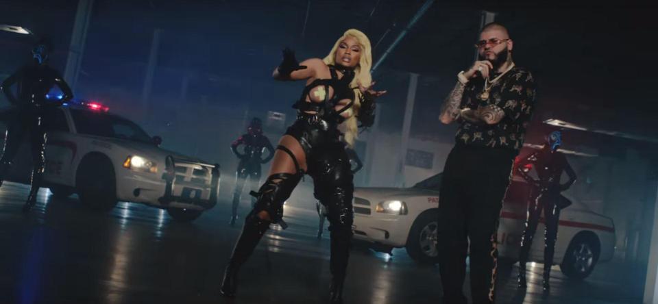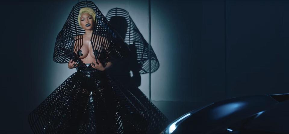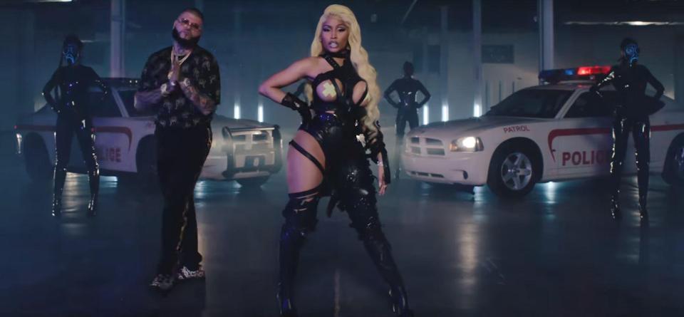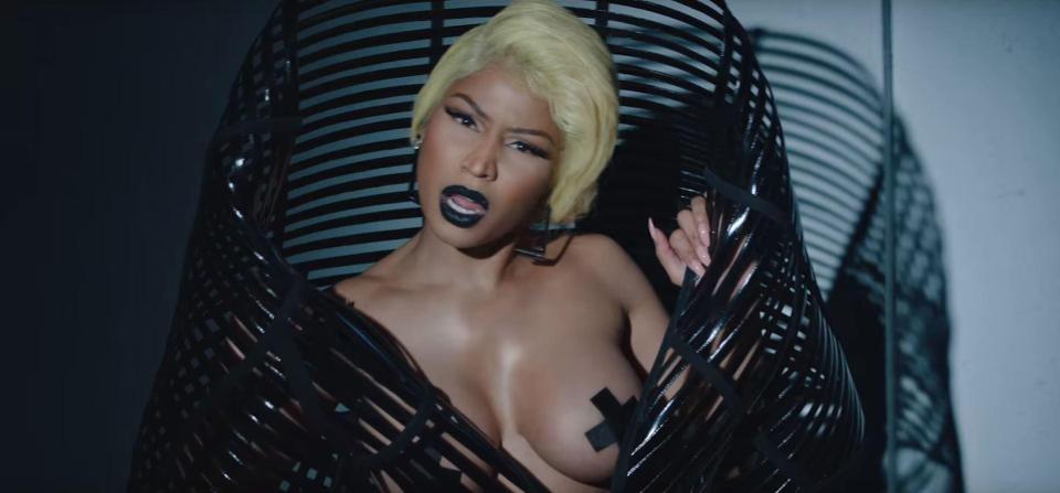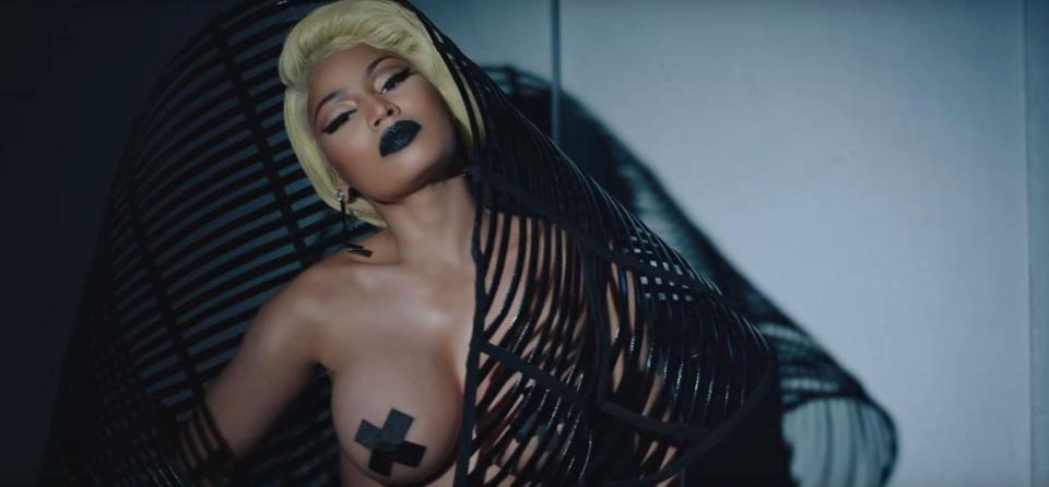 Эпатажная Никки Минаж показала голую грудь в новом провокационном клипе Krippy Kush, где она снялась с рэерами Тревисом СкоттомRvssian и Bad Bunny.