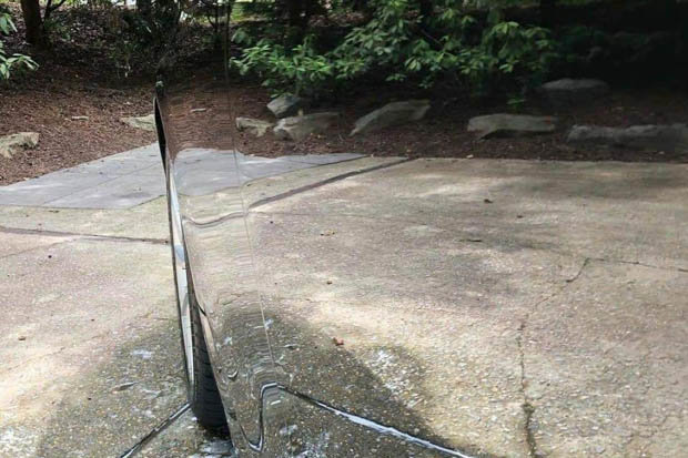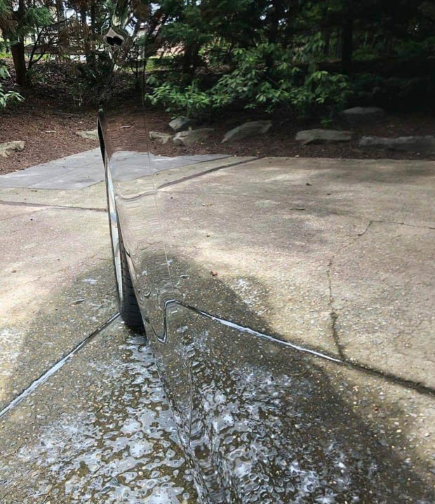 Кадр черного авто, помытого и отполированного до блеска, создает видимость полной картины, тогда как на самом деле это всего лишь отражение. Границы машины и окружающего мира можно увидеть по каплям воды с пеной на асфальте и преломлению отражения растений.