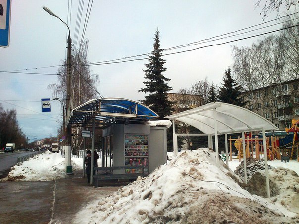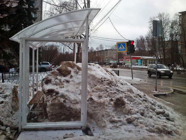 Как рассказывают местные жители, снег в это место сваливается ещё с ноября. Его сгребали со всей дороги. Остановка оснащена скамейкой, к которой, однако, подобраться невозможно. По словам очевидцев, остановка появилась на прошлой неделе, а урна рядом с ней – на днях.