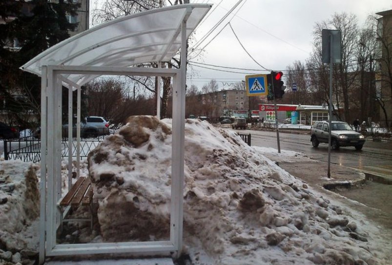 Как рассказывают местные жители, снег в это место сваливается ещё с ноября. Его сгребали со всей дороги. Остановка оснащена скамейкой, к которой, однако, подобраться невозможно. По словам очевидцев, остановка появилась на прошлой неделе, а урна рядом с ней – на днях.