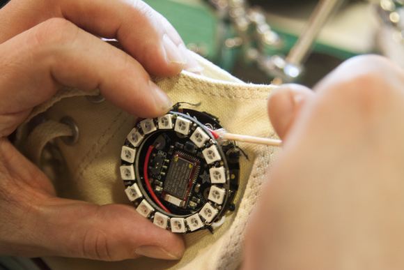 Известный бренд выпустил новую серию кедов «Chuck Hacks», разработанных вместе с креативной компанией Chapter. Теперь в новых моделях благодаря специальной электронной платформе Flora, Bluetooth и кольцу NeoPixel обладатели оригинальной пары обуви смогут узнать об изменениях погодных условий на улице.
