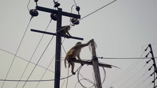 Обезьяна вида гульман забралась на самую верхушку электровышки и не хотела спускаться. Ее пытались выманить орехами, а спасатели даже отключили ток на три часа и полезли за животным.