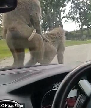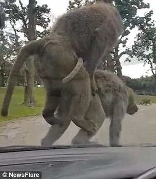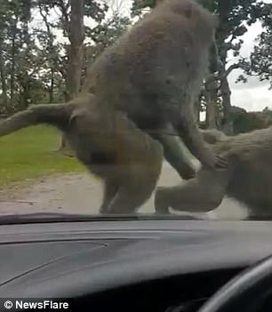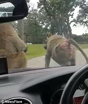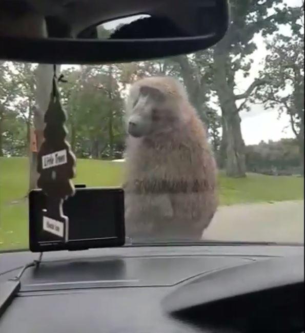 Семейная поездка в британский сафари-парк Ноусли превратилась в настояний курьез, когда на капот машины главы семейства прыгнула обезьяна. Она вела себя по-свойски, испугав малыша в авто.