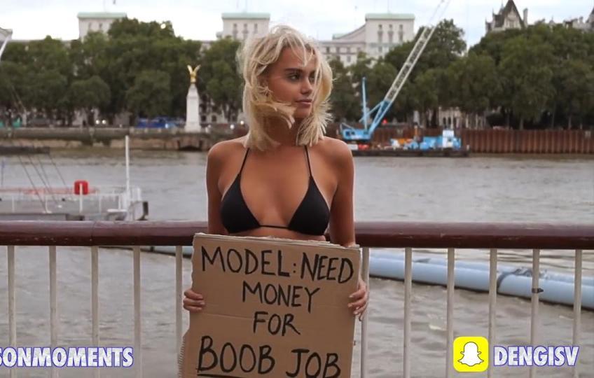 Девушка в центре Лондона разделась до нижнего белья и стала с надписью «Модель: нуждаюсь на операцию по увеличению груди». Таким образом она спровоцировала очень разную реакцию похожих. Кто-то делал селфи с ней. Одна женщина начала убеждать героиню перформанса, что подвергать своё тело пластической операции опасно и имплантаты содержат радиоактивные вещества.