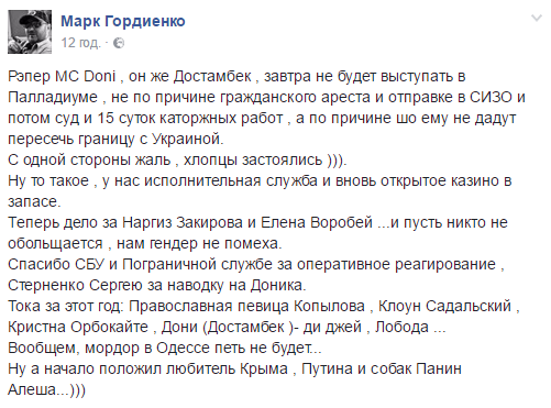 «Рэпер MC Doni, он же Достамбек, завтра не будет выступать в «Палладиуме», не по причине гражданского ареста и отправке в СИЗО и потом суд и 15 суток каторжных работ , а по причине, что ему не дадут пересечь границу с Украиной. С одной стороны жаль , хлопцы застоялись», — рассказал Гордиенко.