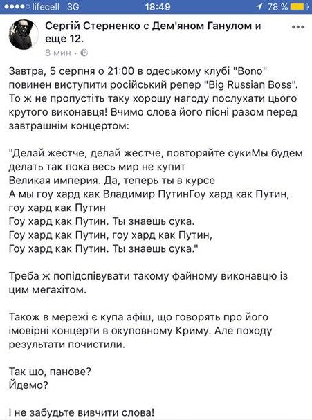 Одесский активист Сергей Стерненко в своем Facebook призывал одесситов сорвать концерт российского репера Big Russian Boss. Выступление запланировано на вечер субботы, 5 августа в местном клубе «Bono».