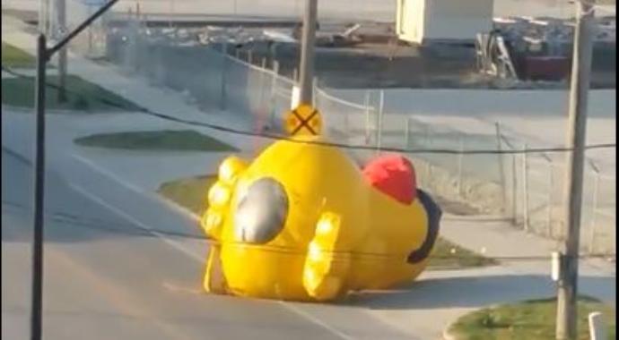 В американском штате Айова прямо посреди проезжей части случился казус. Огромная надувная утка оторвалась от крепления и под действием ветра начала кататься по трассе.