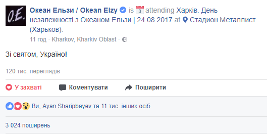24 августа в день независимости культовая украинская группа «Океан Эльзы» провела крупный концерт в Харькове. В его рамках музыканты исполнили гимн Украины. Им активно подпевала публика. Этот ролик активно разошёлся по сети и собрал больше 120 тыс. просмотров лишь за полдня.