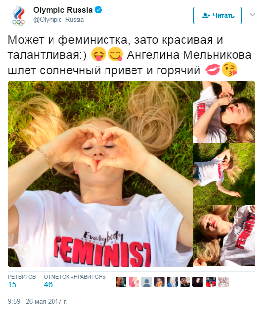 Слова был подкреплены снимков гимнастки Ангелины Мельниковой в футболке с надписью «Все должны быть феминистками».
