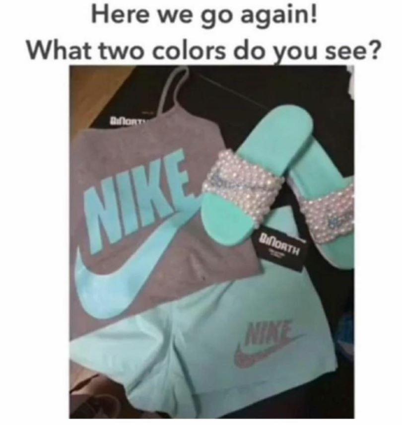 В Сети разразился новый спор из-за цвета спортивного женского летнего костюма Nike и шлепанцев. Часть пользователей утверждает, что цветовая гамма одежды — серый и голубой, другие же уверяют, что это розовый и белый.