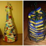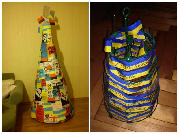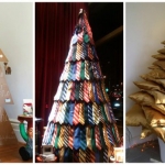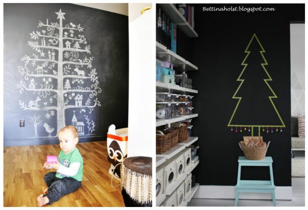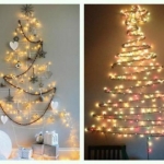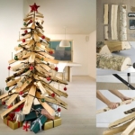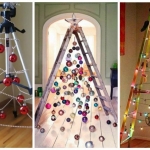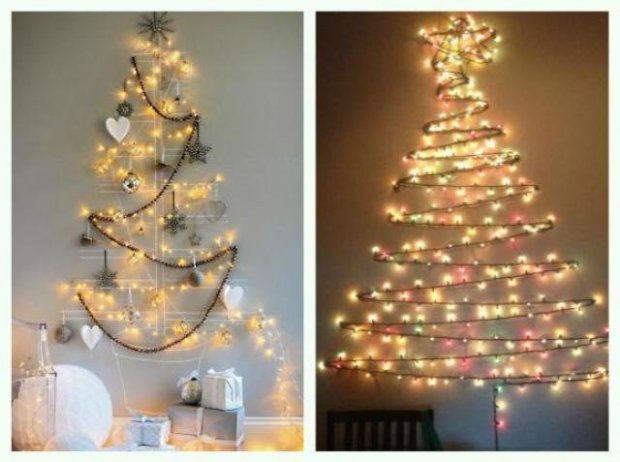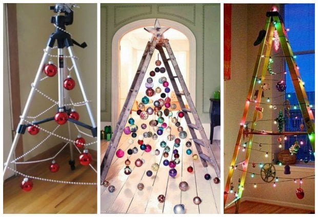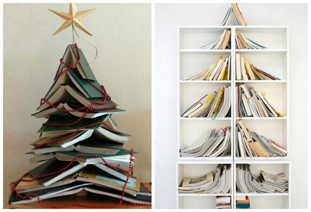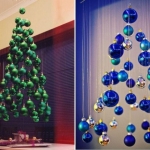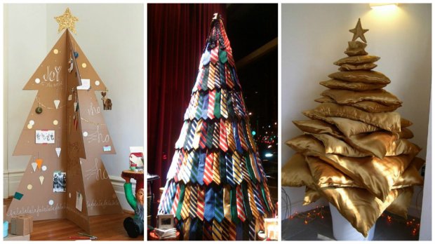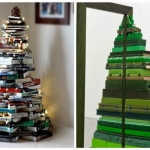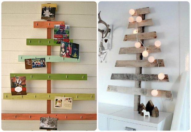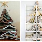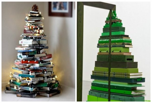 Для конструирования таких новогодних деревьев достаточно обычных досок, палок, лент или нескольких десятков книг. Также они нередко занимают намного меньше места. Например, плоские ёлки крепятся на стене. Но наиболее неожиданным и оригинальным вариантом ёлки является дерево, созданное из подручных средств.