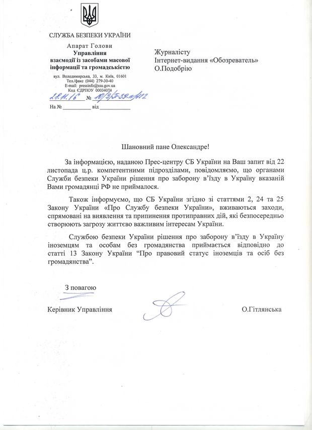 Далее приводим документ с ответом от СБУ, суть которого сводится к тому, что Орбакайте не объявлялась в Украине персоной нон грата: