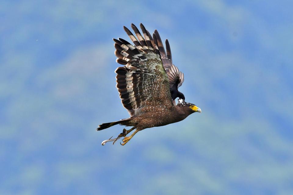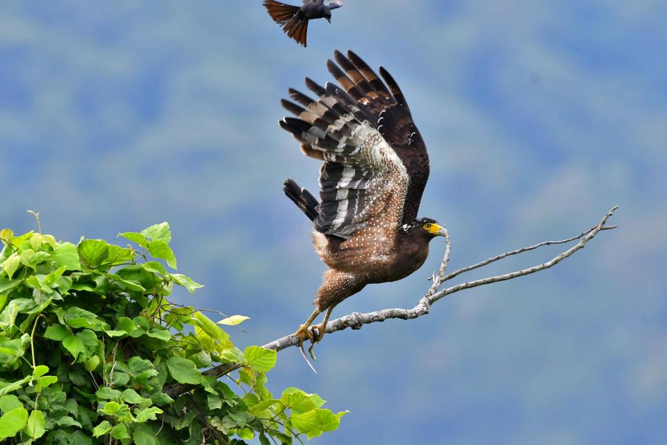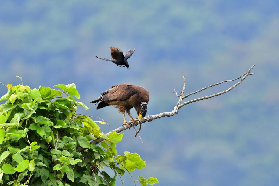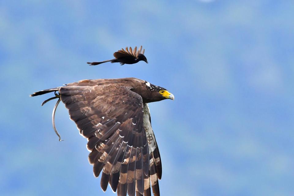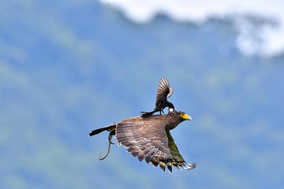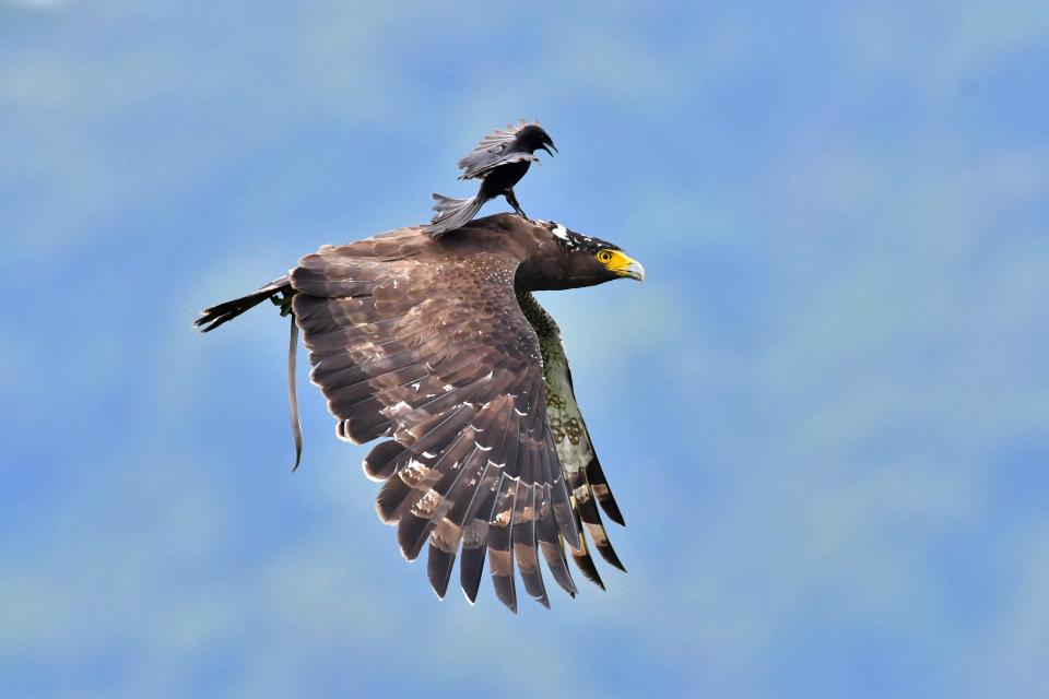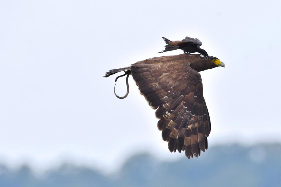 Орел только сел на дерево, чтобы полакомиться своей добычей, змеей, как внезапно ему на шею сел черный дронго.