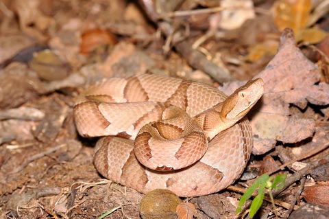 Эта змея очень опасна и ядовита. Родом из Северной Америки и способна убить человека. Медноголовый щитомордник умеет мастерски прятаться, поэтому заметить его на земле среди листьев непросто.