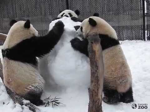 В зоопарке Тортонто семья панд очень удивилась, обнаружив в своем вольере снежную бабу. Они решили проверить сооружение из снега на прочность и очень потешно стали пытаться его развалить.