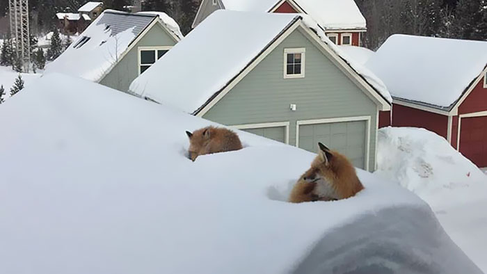 Ответ оказался прост. В городке Брекенридж, Колорадо, за последнюю неделю выпало очень много снега, и лисы взобрались по нему, словно по лестнице. Дорога их так утомила, что эти очаровательные создания прилегли на крыше вздремнуть, уткнувшись в свои пушистые хвосты пытливыми мордочками.