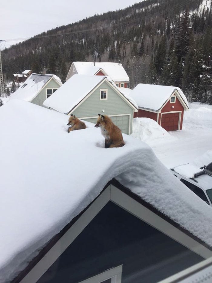 Ответ оказался прост. В городке Брекенридж, Колорадо, за последнюю неделю выпало очень много снега, и лисы взобрались по нему, словно по лестнице. Дорога их так утомила, что эти очаровательные создания прилегли на крыше вздремнуть, уткнувшись в свои пушистые хвосты пытливыми мордочками.