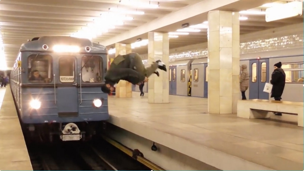 Анонимный экстремал совершил опасный прыжок перед движущимся составом метро. Перепрыгнув с одной стороны перрона на другую, парень сделал сальто. Трюк удалось совершить буквально в паре метров от приближающегося состава метро.