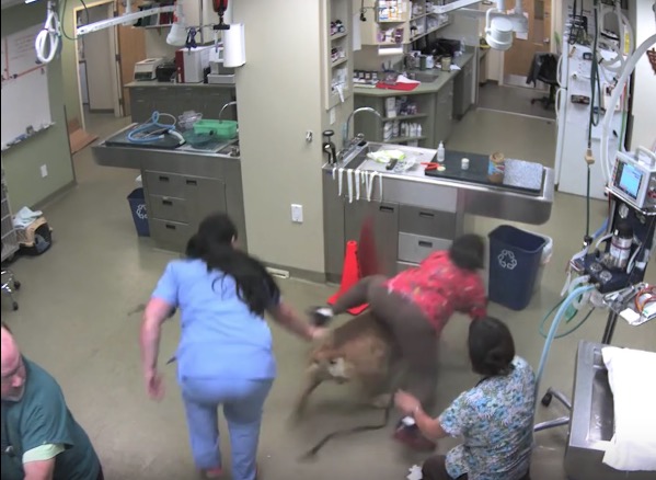 После неудачной попытки угомонить «пациента», пес вскочил и сбежал из кабинета. При этом, он унес на своей спине одну из медсестер. Одна из коллег побежала спасать женщину, тогда как остальные ветеринары кабинете разразились хохотом.