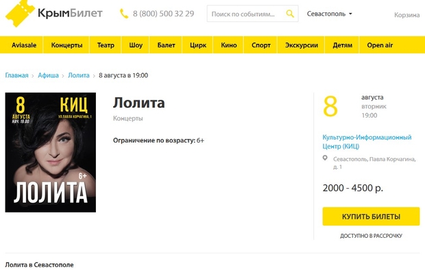 Эпатажная российская певица Лолита Милявская проведёт большой концерт в аннексированном Крыму. Информация об этом появилась на портале КрымБилет. Выступление состоится в 8 августа в Культурно-информационном центре Севастополя.